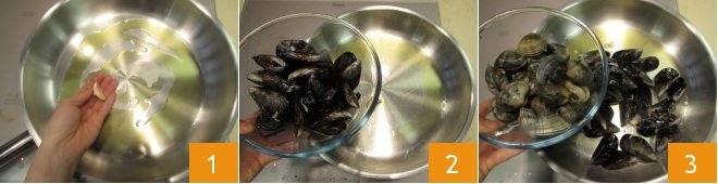 Add a drizzle of oil to a pan with high sides, slice into an unpeeled garlic clove 1, add it to the oil and brown. Now add the mussels 2 and clams 3.