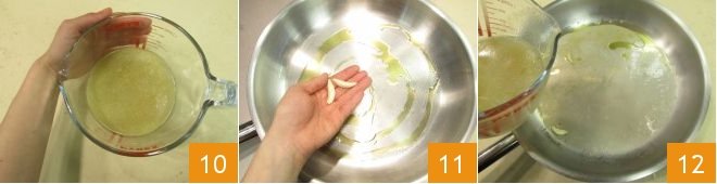In this way you will obtain the cooking water of the mussels and clams 10. Now take a large pan. Add a drizzle of oil and a peeled garlic clove cut in half 11. Leave it to brown without darkening too much. Once golden, remove the pan from the heat: be careful as this operation is delicate and it is best that you are next to a sink. Now gradually pour the cooking water of the mussels and clams to the browned garlic in the pan, take care not to burn yourself because it may splash 12.