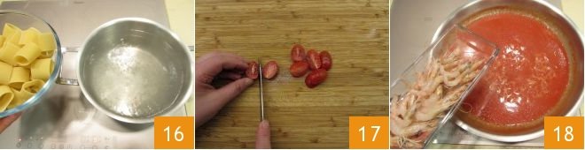 Leave to cook in this way for 10-12 minutes. In the meantime cook the mezzi paccheri in boiling water salted to taste 16, stir frequently to make sure the pasta does not stick to the bottom of the pan. Always pay attention to cooking times: our paccheri required around 20 minutes.?In the meantime cut the tomatoes in half 17. Once the 12 minutes are up, add the shrimps 18,