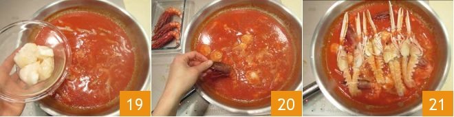 the scallops 19 and the king prawns 20, arrange them in an orderly and uniform way to flavor the sauce. Place the scampi on top 21,