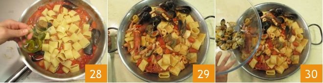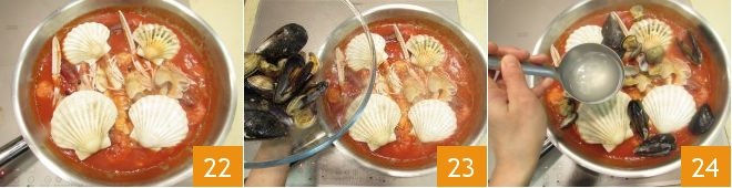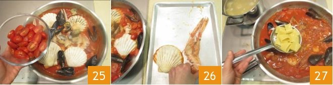topped by the scallop shells facing down, to create a sort of lid 22. Turn the flame up slightly and add the mussels and clams that have not been removed from the shell 23. If the sauce becomes too dense, add a ladle of pasta cooking water 24.