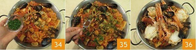 sprinkle over the pasta, together with the chili pepper 35. Garnish with a drizzle of oil; arrange the scampi, scallop shells and serve 36.