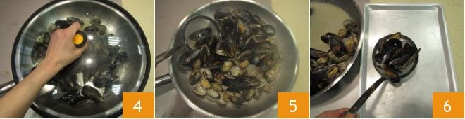 Cover with the lid immediately 4, so that they open up with the heat. To turn them over without removing the lid, you can saute them, use a serving cloth so that you don't burn yourself. In this way those underneath with emerge on top. As soon as they all open, remove the lid and stir with a skimmer 5. Do not cook them for too long otherwise they will become dry. Use the skimmer again to drain and place the mussels and clams on a tray 7, but leave the sauce inside the pan.