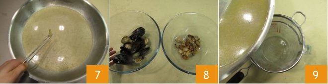 Remove the garlic 8. Clean around half of the clams and half of the mussels 8, remove them from the shell. The others will be used to garnish the dish. In the meantime, the clams will have purged any sand, which will deposit at the bottom of the pan. Now place a colander over a bowl and delicately filter the sauce 9, be careful not to add the sediment.