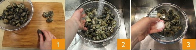 To prepare pasta Marinara, start by cleaning seafood. Start by cleaning the clams. First of all, make sure there are no broken or empty shells and discard them immediately. Now beat them against a cutting board to eliminate any sand inside 1. Place the clams in a colander over a bowl and rinse them 2. Place the colander in another bowl, fill with water and add abundant coarse salt, to recreate a sort of sea water. Leave the clams to soak for 2-3 hours 3. This will flush out any remaining sand.