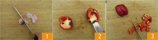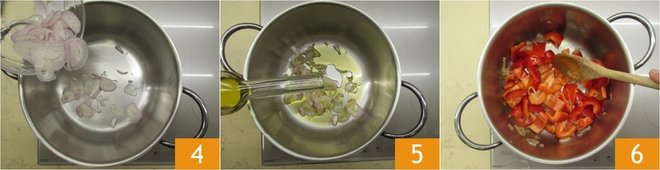 Pour the shallot into a pan 4, drizzle with oil 5, and sauté for a couple of minutes. Add the bell peppers to the shallot sauté 6.