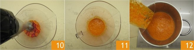 transfer everything into a tall glass and blend with an immersion blender 10 until you get a smooth cream 11. Pour the bell pepper cream into a large pot 12,