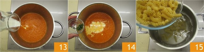 add the fresh cream 13, thyme 14, and adjust the pepper and salt. Keep it warm. Meanwhile, cook the fusilli in boiling salted water 15.