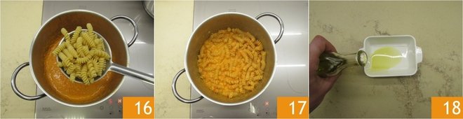 Drain the al dente fusilli and transfer them to the pot with the bell pepper cream 16, stir to flavor 17. Grease 4 individual mini cocottes with oil 18.