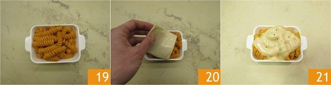 Pour the pasta 19. Place a slice of cheese on top of the pasta for each cocotte 20 and put it in a preheated oven, grill mode for 1 minute. Remove from the oven and season with pepper 21. The pasta with bell pepper and cheese cream is ready, enjoy it hot!