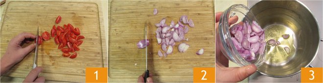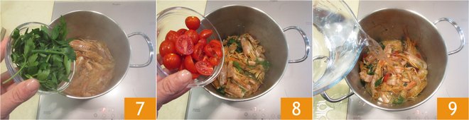 Add the parsley 7 and the cherry tomatoes cut in half 8, then cover with water 9.