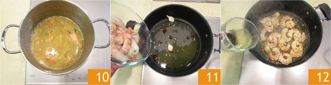 Cook over medium heat for about 30 minutes, using a skimmer to remove the foam that will form on the surface 10. In the meantime, bring a pot of water to a boil to cook the pasta. About 20 minutes into the cooking of the broth, heat the oil in a pan and flavor it for a few minutes with the chili pepper and the clove of garlic in its skin. Add the prawns 11 and sauté for 1-2 minutes, then deglaze with white wine 12.