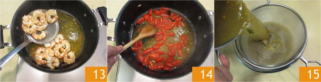 When the wine has completely evaporated, remove the garlic and take the prawns out of the pan, leaving the cooking base 13. Keep the prawns aside covered. Add the cherry tomatoes cut into quarters in the same pan 14 and cook for about 5 minutes 15.