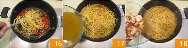 In the meantime, the water will have come to a boil, so salt it and cook the pasta for half of its cooking time, because it will finish cooking in the pan. In the meantime, strain the broth. Drain the pasta very al dente and transfer it to the pan 16. Finish cooking the pasta by adding the broth little by little 17, as for risotto. Once cooked, add the prawns 18 and season with salt and pepper.