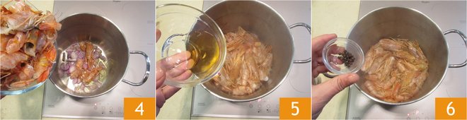 Also add the shrimp scraps 4 and sauté them over high heat stirring and mashing with a wooden spoon, then deglaze with white wine 5 and season with white and black peppercorns 6.