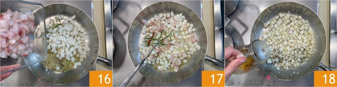 Add the fish chunks 16 and let them brown for a few minutes, then remove the chili pepper and parsley sprigs 17. Deglaze with the brandy 18.