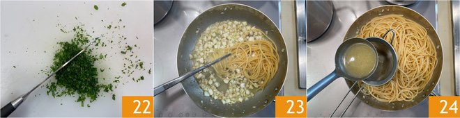 While the pasta is cooking, chop the parsley leaves, thyme, and marjoram 22. Drain the spaghetti a few minutes early and add them to the pan with the fish 23. Add the filtered fish broth 24 and if needed, some cooking water.