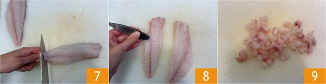 Once you have the two fillets, skin them by running the knife blade from the tail while keeping the skin tight 7. Now remove the bones with the appropriate tweezers 8. Cut the dentix into cubes of less than 1 inch 9.