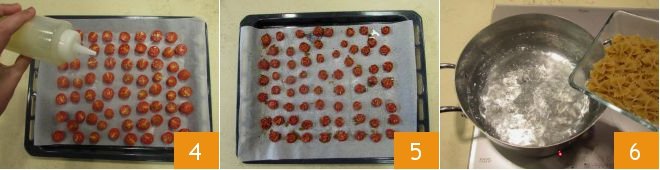 Next, drizzle them with extra virgin olive oil 4 and bake in a convection oven preheated to 250°F (120°C) for around 2 hours. Once the tomatoes are cooked and shriveled, remove them from the oven 5. Cook the pasta in plenty of boiling water, salted to taste 6. Drain the pasta, transfer to a bowl, drizzle with a little oil and leave to cool.