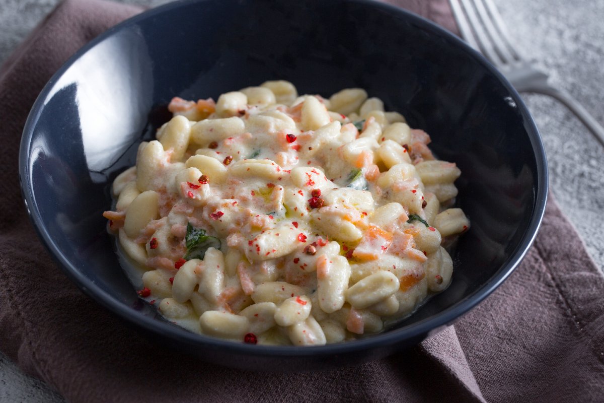 Pasta with burrata cream and smoked salmon is a truly heavenly, quick and simple first course! A few minutes is all it takes to prepare this delicious pasta dish, perfect on every occasion and whatever the season. The smoked flavor of the salmon is a match made in heaven with the sweetness of the burrata cheese, while the pink pepper adds an unexpected aromatic touch! We chose cavatelli for this dish, perfect with the cream, but you could also use spaghetti or any other type of pasta you like. Pasta with burrata cream and smoked salmon will become your favorite recipe: it is quick to make for a truly delicious dinner!