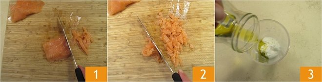 To prepare pasta with burrata cream and smoked salmon, start with the latter. Start by cutting it into strips 1 and then dice into pieces that are roughly 0.4 inches in size 2. Leave to one side and heat a saucepan filled with salted water on the stove, which you'll use for cooking the pasta. Now turn to the cream. Place the burrata cheese in a tall and narrow container and add the extra virgin olive oil 3.