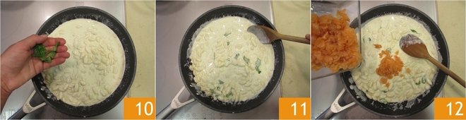 Add the basil leaves 10 and stir 11. Now add the smoked salmon 12.