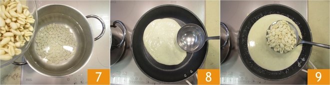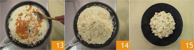 Add the cavatelli pasta as soon as the water starts to boil 7. Cook them according to the instructions on the packet. In the meantime place the burrata cream in a large pan, in which you'll toss the pasta. Add a ladle of cooking water 8 to temper the sauce. Drain the pasta as soon as it is cooked and add it to the cream 9.