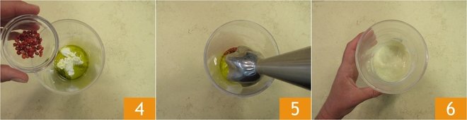 Add 1 spoon of pink pepper corns 4 and blend into a smooth cream 5 using an immersion blender 6.