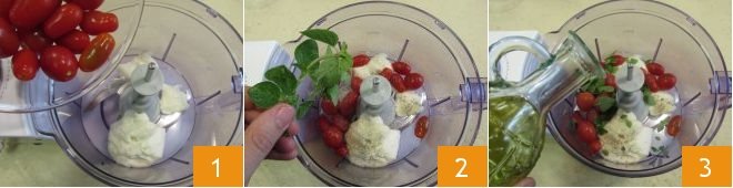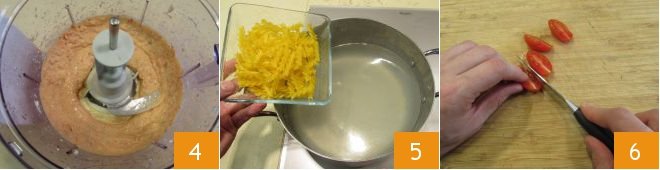 Blend everything until you get a smooth cream 4. Meanwhile, pour the pasta into the boiling water 5 and cook for the time indicated on the package. In the meantime, cut the remaining cherry tomatoes in half 6.