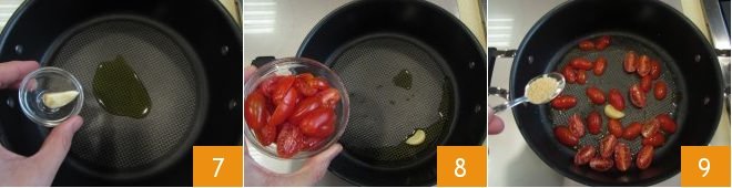 Heat the olive oil in a pan, add the peeled garlic clove 7, let it flavor for a few moments, then add the cherry tomatoes 8 and the brown sugar 9