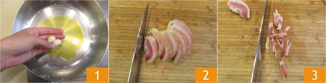 To make pasta with chickpeas and guanciale, start by browning the garlic clove in a pan with a drizzle of oil for a few minutes, on a medium flame 1. In the meantime, remove the rind from the guanciale and cut it into slices that are around 0.2 inches thick 2 and then into strips 3.