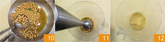 Once the chickpeas are cooked 10, remove the rosemary and place them in a glass with their juice. Use an immersion blender 11 to blend into a puree 12.