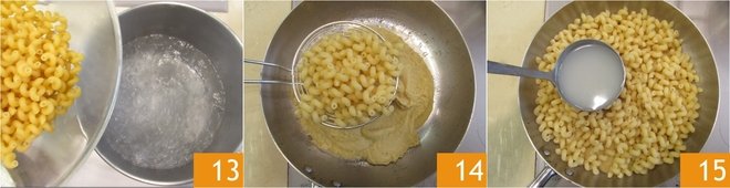 In the meantime, cook the pasta in the boiling salted water 13 and remove 2 minutes before the cooking time indicated on the packet. Drain the pasta and add it to the pan with the chickpea puree 14; cook on a medium flame. Finish cooking the pasta; be sure to add a ladle of the cooking water 15.