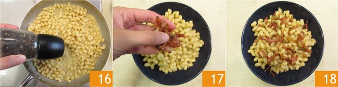 Lastly, flavor with pepper 16, a drizzle of oil and salt. Add a part of the guanciale to the pan, stir thoroughly and arrange onto plates. Garnish the plates with the remaining jowl 17 and serve your pasta with chickpea cream and guanciale nice and hot 18!