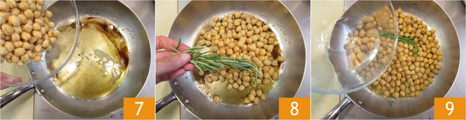 Add the precooked and drained chickpeas to the same pan 7 along with a sprig of rosemary 8; flavor for ten minutes or so, once again on a medium flame. Once this time is up, add the water 9 and cook for another 10 minutes. Place a saucepan filled with water on the stove and add salt when it comes to the boil, for cooking the pasta.