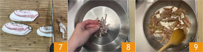 Cut the guanciale bacon into strips in the meantime 7. Brown the jowl bacon in a thoroughly heated pan 8 until the fat becomes transparent 9.