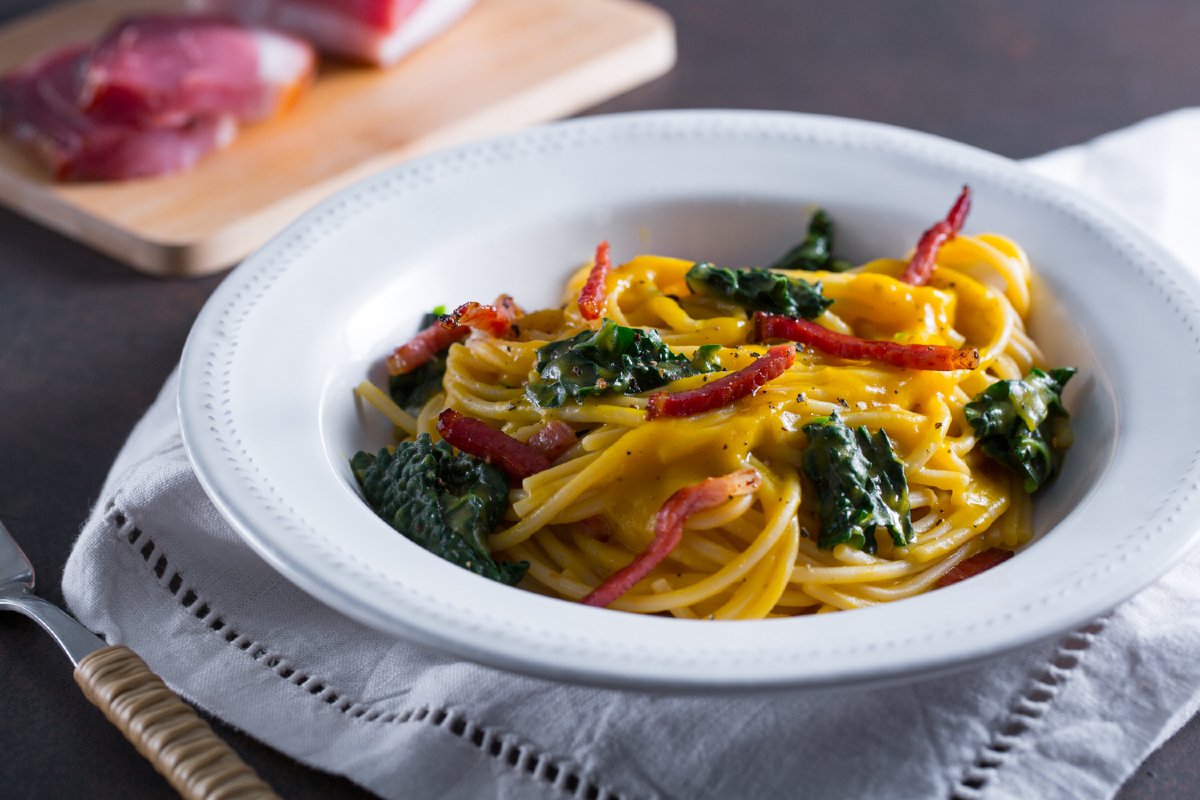 Pasta with delicata squash cream and black cabbage is a first course that contains all the flavors and colors of autumn. Squash, the undisputed queen of this season, is one of the ingredients featured in this pasta dish. Its sweet flavor is delicious paired with the decisive taste of black cabbage and sapidity of the speck. We've made lots of recipes with squash, but we're especially fond of this one. The spaghetti are enveloped in a delicious cream flavored with thyme, made all the more inviting by the crispy speck! This pasta dish is simple to prepare and is genuinely good, an autumn treat that everyone will love!