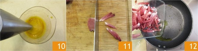 Blend into a smooth cream 10 with an immersion blender and leave to one side. In the meantime, cut the speck into slices that are around 0.2 inches thick, then into 0.2 inch strips 11. Brown on a high flame in the same pan you cooked the squash in and add a drizzle of oil if necessary 12.