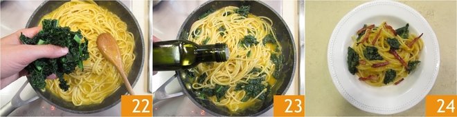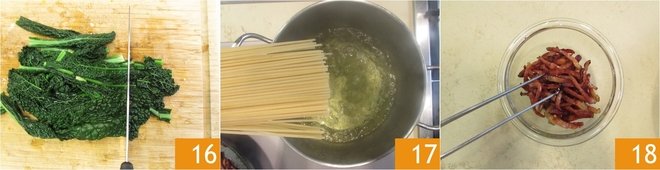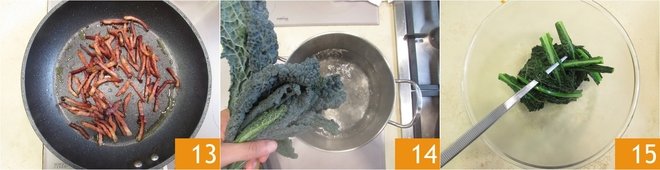 Brown thoroughly, then remove from the heat 13. Blanch the Italian kale leaves in boiling salted water for 3 minutes 13, then remove with a pair of tongs 15. Save the water to cook the pasta.