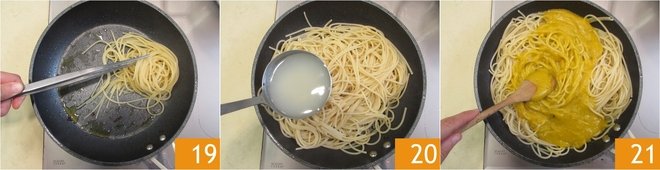 Remove the pasta as soon as it is done with a pair of tongs and add it straight to the saucepan you cooked the speck in 19. Add a couple of ladles of cooking water 20 and add the cream of squash too. Stir thoroughly.