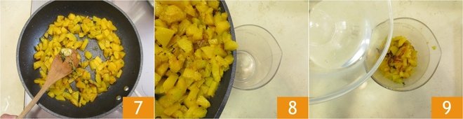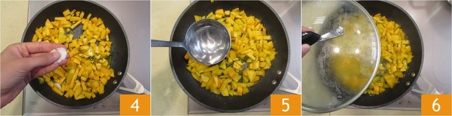 Add the squash and brown it on a high flame for a few minutes. Add salt 4, pepper and 2 ladles of water 5. Lower the flame and cover with the lid 6.