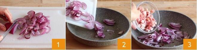 To make pasta del maresciallo, start by peeling and finely slicing the onion 1. Place the sliced onion in a pan 2, together with the pancetta bacon 3