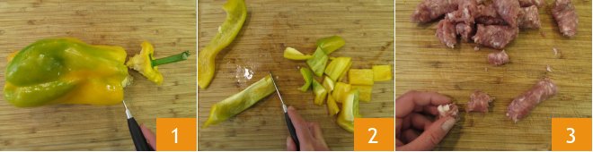To prepare the pasta with peppers, sausage, and feta, we start with the vegetables. After cleaning the peppers 1 cut them into irregular pieces of about 3 cm (1 1/4 inches) 2. Break the sausage by hand into pieces of about 2 cm (3/4 inch) after removing the casing and move to the stove 3.