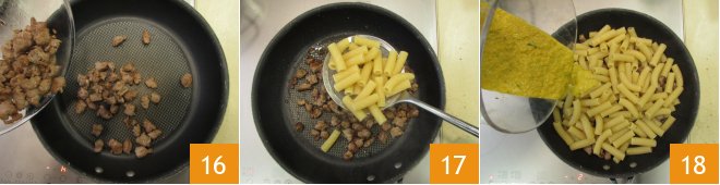 Return the sausage to the pan, heat 16, and when the pasta is cooked, drain it directly into the sauce 17. Add the pepper cream 18.