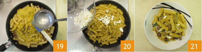 Obtain a smooth cream and set aside 13. Crumble the feta with a knife, or even by hand for a more rustic effect 14, and return to the stove. Drop the rigatoni into boiling salted water to be drained al dente 15.