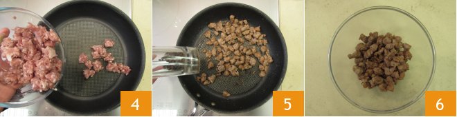 Heat a non-stick pan and add the sausage 4, cook over high heat for about 5 minutes, add a pinch of pepper 5, and when it is well colored, place it in a bowl 6.