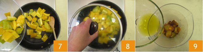 In the same pan, add the chopped peppers 7, salt, and cover with the lid, cooking for about 10 minutes on low heat 8; we will need the pan again later. Meanwhile, put a pot of water on the stove to cook the pasta. When the peppers are cooked, transfer them to a blender bowl and add the oil 9.