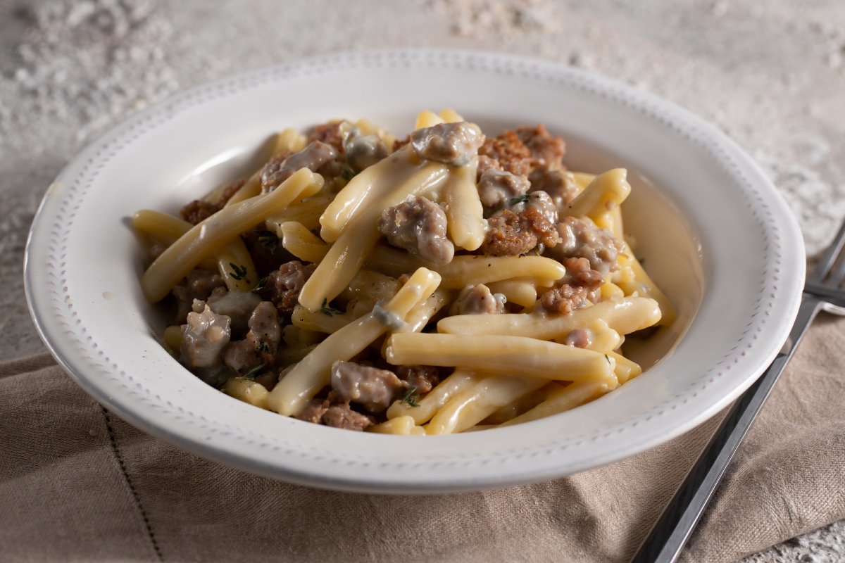 When experimenting with new pasta recipes, we discovered that gorgonzola goes with everything: radicchio, saffron and pumpkin; in this pasta with sausage and gorgonzola, we present you with a new and delicious ally! The rich savory flavor of sausage all the creaminess of sweet zola cheese will envelop the casarecce pasta in flavor. You'll have a tough time finding a tastier pairing; this preparation is also easy and quick to make, a truly foolproof way to serve something delicious!