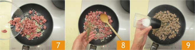 Add the finely chopped sausage to the pan with the onion 7, along with the fresh thyme sprig 8. Cook on a high flame for around 10 minutes, until the sausage is brown, then add salt 9. Place a saucepan filled with water on the stove and add salt when it starts to boil.