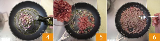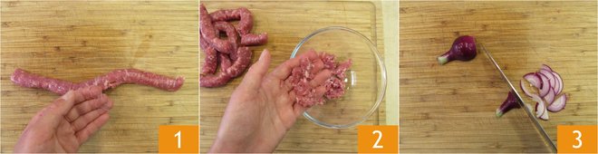 To prepare pasta with sausage and taleggio cheese, decase the sausage 1 and crumble by hand 2. Peel and thinly slice the onion 3.